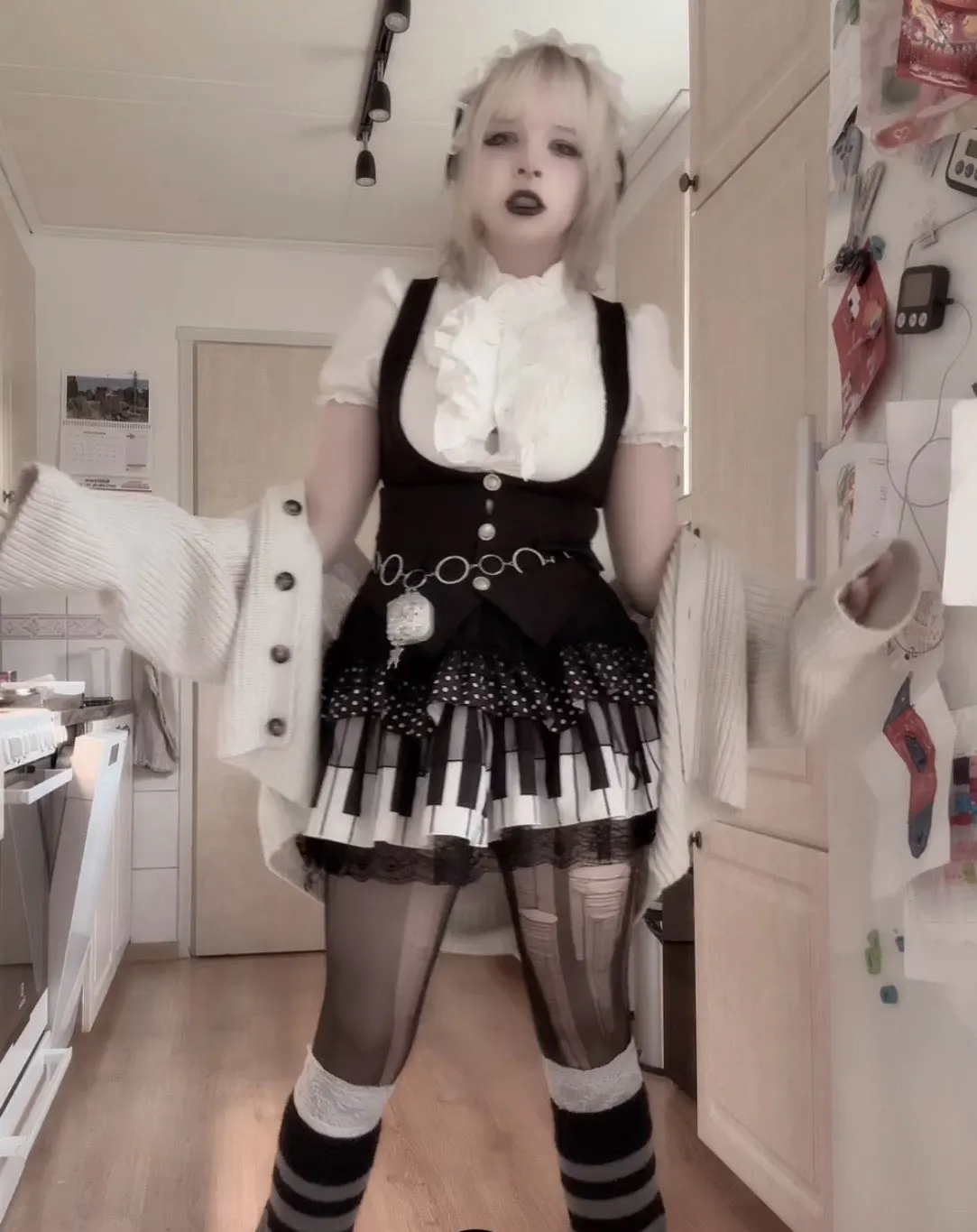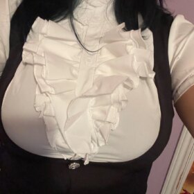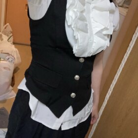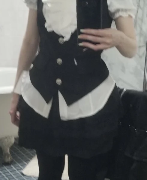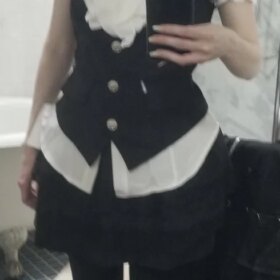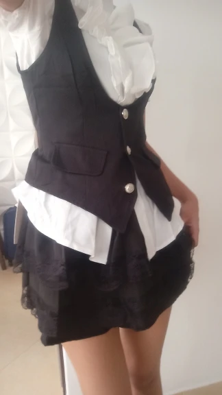 Lovely! I later slightly tightened it at the waist, but on the big hips and thighs, the skirt is incredibly short + it has an elastic band. The skirt has shorts, but they roll up (((☕️ the white sweater is slightly see-through, but it’s not fatal✉️ otherwise, the product is of high quality, pleasant and looks beautiful. I recommend it, unless for people with curvy figures the skirt might be too small:3